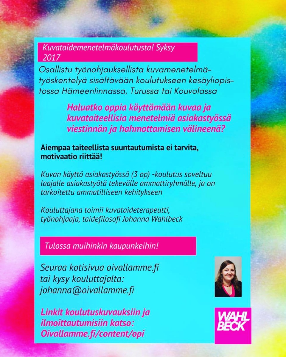 Taidefilosofi (FM). Kuvataideterapeutti. Työnohjaaja (STOry). Intohimoina ihmiset, taide ja hyvinvointi. Art Philosopher (MA), Art Therapist, Supervisor (STOry), passionate about people, art and wellbeing.